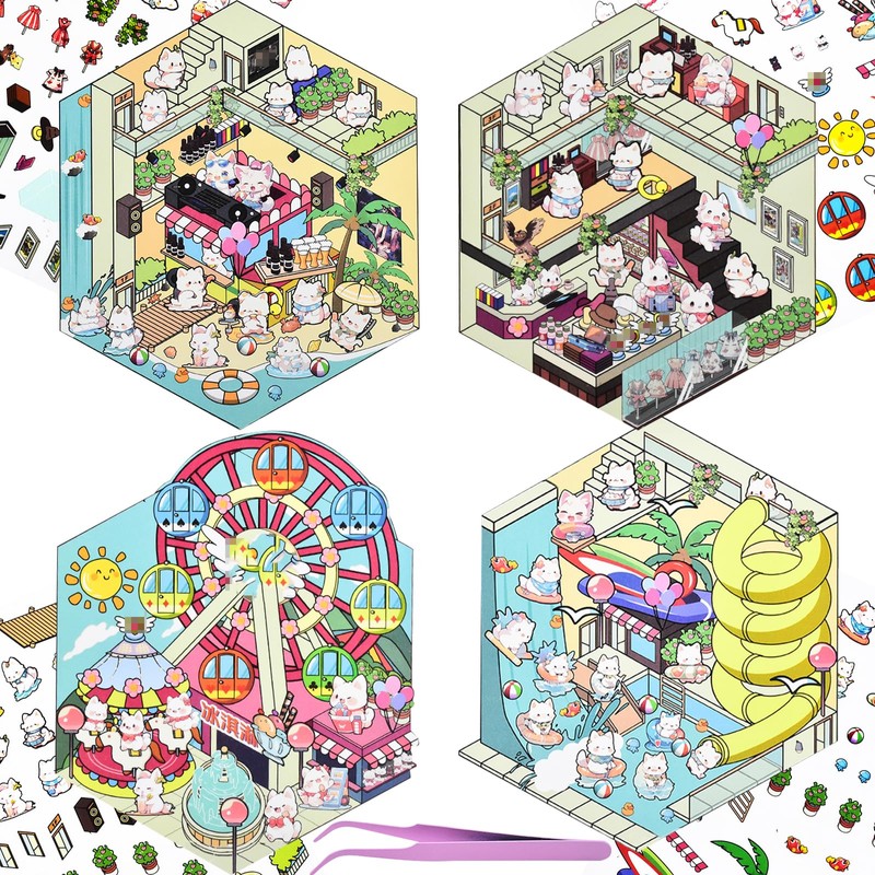 - DIY 3D House Scene Stickers: You will receive 4 sets DIY 3D House scene stickers and tweezers containing 4 different scenes, including animal themed beach surfing shopping park, more fun and creative.