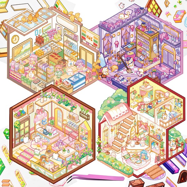 - DIY 3D House Stickers: You will receive 4 sets DIY 3D mini house scene stickers and a tweezer containing 4 different scenes including Animal-themed clothing stores, magic shops, convenience stores, coffee shops, very fun and creative.