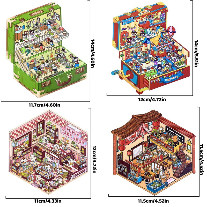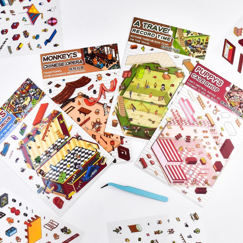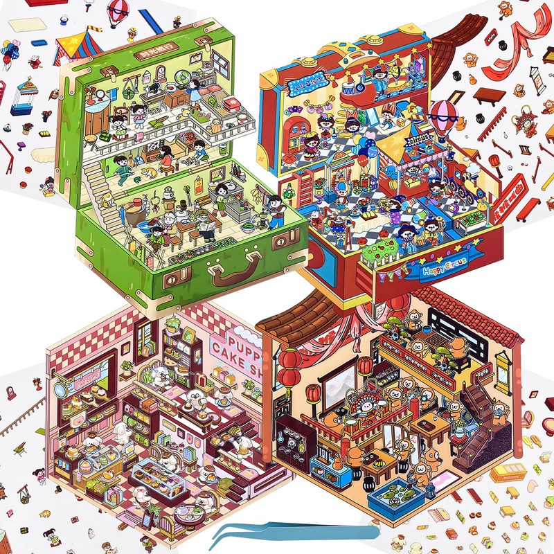 • DIY 3D House Stickers: You will receive 4 DIY 3D mini house scene stickers and a tweezer containing 4 different scenes including monkey opera, puppy candy shop, clown circus, time travel box, very fun and creative.