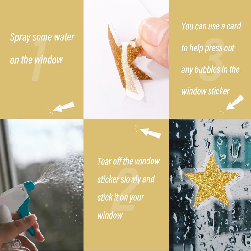 - ✨【How To Use】: 1. Clean the surface of the pasting position, and the surface must be smooth and flat; 2. Spray some clean water on the clean glasses surface (in order to facilitate movement and calibration after pasting, it is recommended to drop 1-2 drops of detergent); 3. Slowly lift the window sticker, stick the window sticker to the glass surface. 4. Scrape off excess moisture and bubbles with a scraper or bank card to make the stickers stick firmly on the glass; 5. Finish!!