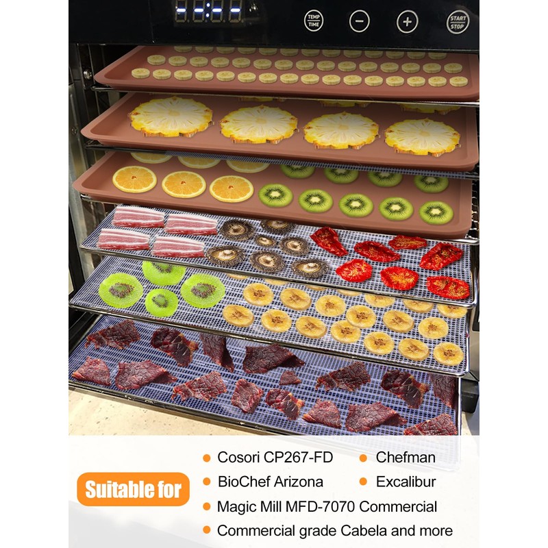 - Premium Material: The dehydrator fruit trays are made of food grade silicone, BPA free, safe, non-toxic, non-stick, won't deform when heated, easy to clean and reusable. Note: Since the silicone is soft and cannot be used alone, it should be placed on a hard tray before serving food. Besides, because it is made of silicone, it is easy to change shape and the food is easier to remove.