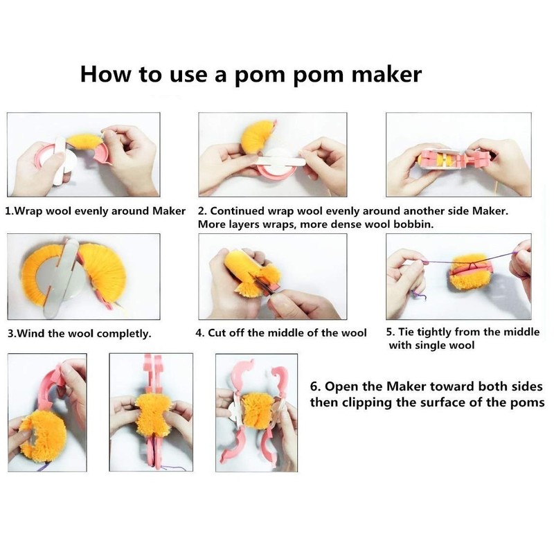 • EASY TO USE: Just need some yarn and one sharp scissors. Wrap the yarn around the two arms of pompom makers evenly, push the arms back after finishing winding, cut all around the center, and tie these fibres with a string. It only takes 10 minutes or less after you master. You can search "detailed pom pom maker instructions" on google, or find "pom pom maker" on youtube.