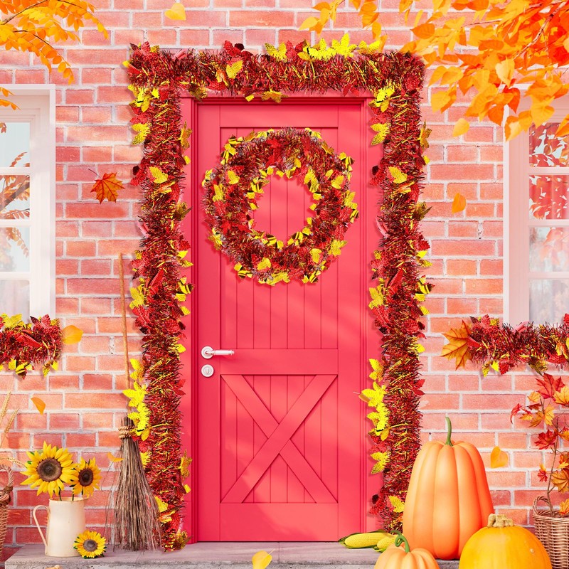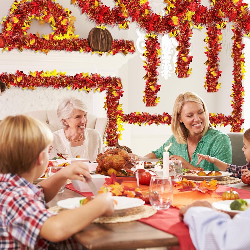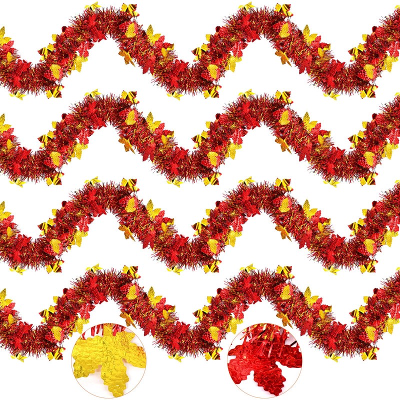- High-Quality Thanksgiving Tinsel Garlands– These garlands are crafted from shiny metallic tinsel with vibrant red and gold maple leaves, each measuring 6.6 FT long. Their eye-catching shimmer makes them a standout decoration for any fall or Thanksgiving celebration.