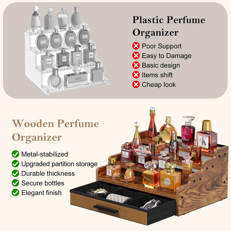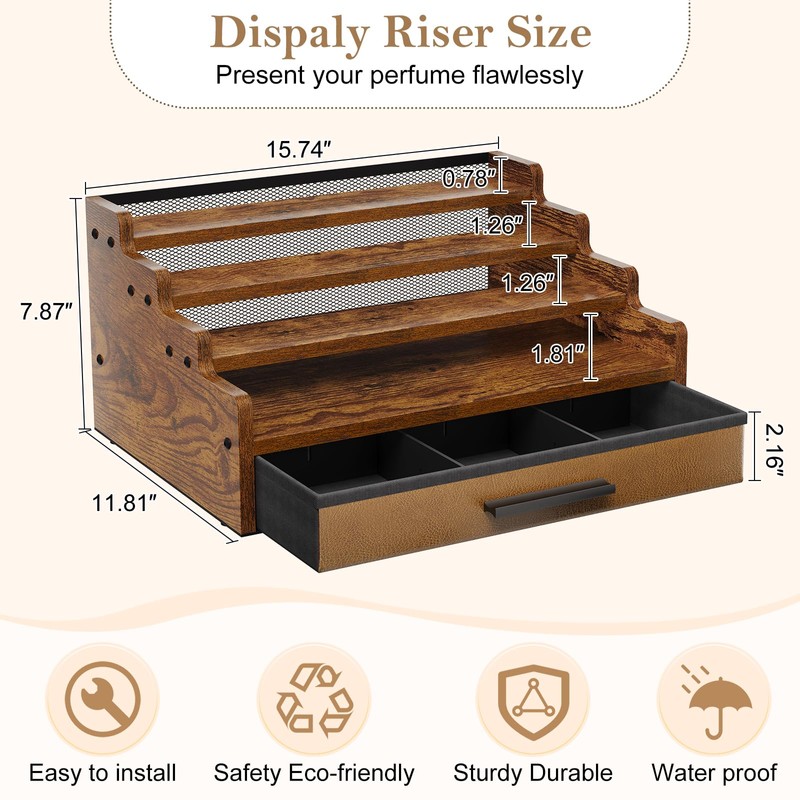 4-Tier Wooden Perfume Organizer for Dresser – Stylish Storage for Fragrances & AccessoriesThis versatile 4-tier cologne stand combines retro design with practical storage, perfect for organizing perfumes, colognes, cosmetics, watches, and small decor items on dressers, bathroom vanities, or bedroom countertops.Key Features:Multi-Functional Storage: Holds perfumes, colognes, makeup, mini bottles, small plants, and accessories. Keeps items visible, accessible, and clutter-free while enhancing space aesthetics with its rustic-modern appeal.Maximized Space: 4 open shelves + 1 large drawer with adjustable dividers (for watches, keys, headphones) offer categorized storage to optimize dresser or vanity space.Secure & Stylish Design: Wooden side fences and breathable iron mesh back prevent slips while adding vintage charm. Drawer features a fabric-lined interior for protection and a leather-textured exterior for sophistication.Durable Build: Crafted from solid wood with a smooth, water-resistant finish. Includes 6 anti-scratch EVA pads for stability and furniture protection. Wipes clean easily for long-lasting use.Easy Setup & Support: Comes with all hardware and clear instructions. Measure your space before purchase; contact us anytime for assistance.Perfect for men and women, this organizer elevates grooming routines or vanity setups with its blend of functionality and timeless design. Ideal as a birthday, holiday, or housewarming gift for fragrance lovers and organized spaces.