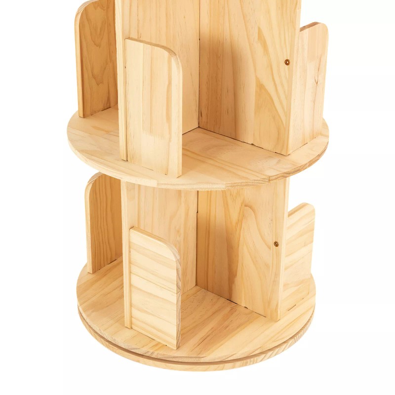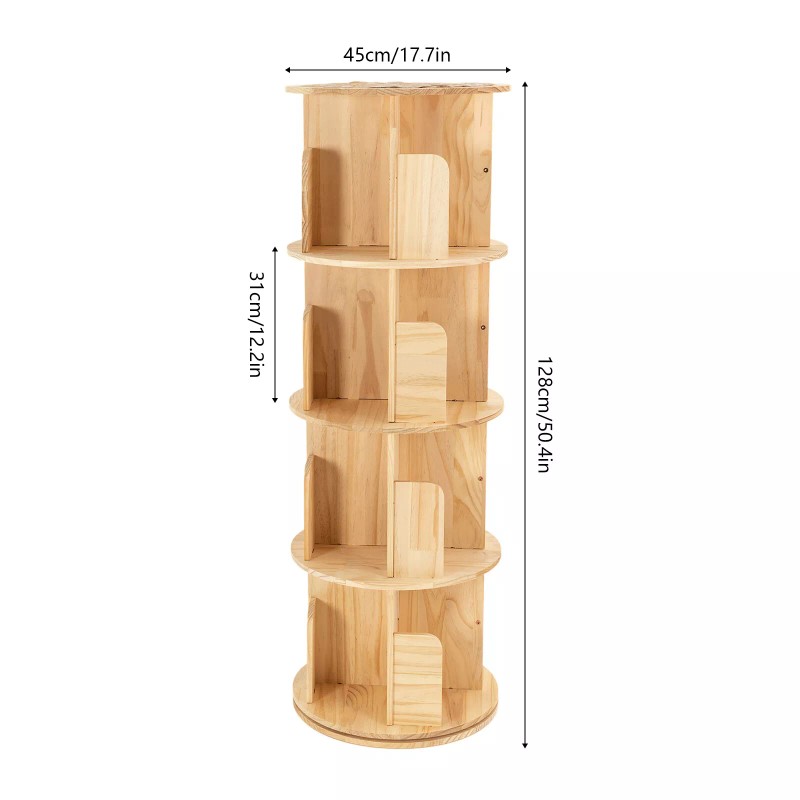 SpecificationMaterial: Solid Wood(Pine), Stainless SteelStyle: ModernShape: CylinderColor: WoodSpecial Features: 360-RotationNumber of Items: 1Number of Tiers: 4Number of Compartments: 16Rotation: 360°Assembly Required: YesMount Type: Floor StandingThickness: 12mm/0.47inNet Weight: 13.5kg/29.8 lbGross Weight: 14kg/30.8 lbLoad-bearing Capacity (Each Tier): 25kg/55 lbEach Tier Height: 31cm/12.2inProduct Size(D*H): 45*128cm/17.7*50.4inPackage Size: 52*50*21cm/20.5*19.7*8.3in Package Included1 x Rotating Bookshelf1* English Installation Diagram1* Schematic Diagram of Sandpaper GrindingAll Accessories for Assembly