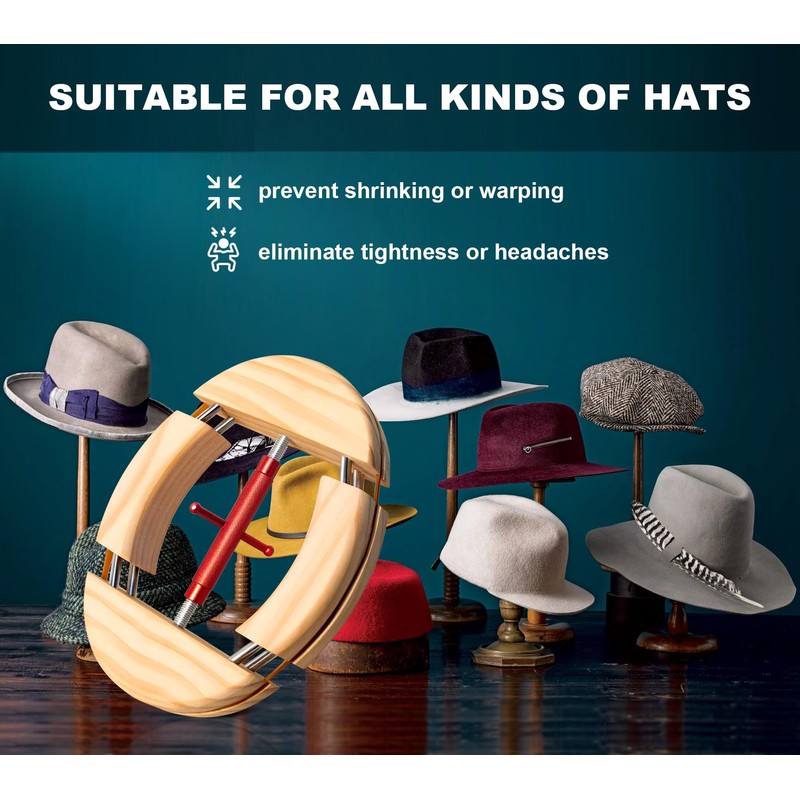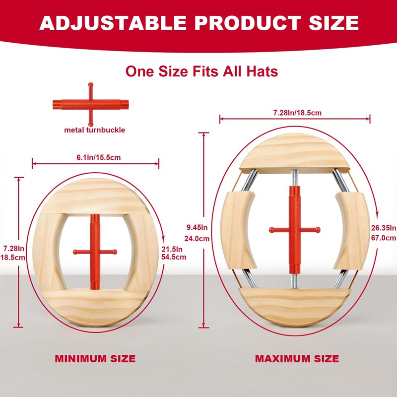 • Premium Materials: Our fitted hat stretcher is meticulously crafted using selected solid wood sourced from North Europe; The fully adjustable heavy-duty turnbuckle is made of super-strong metal, ensuring durability and long-lasting performance; This combination of high-quality materials not only provides strength but also gives the hat stretcher for fitted hats an elegant and sophisticated look