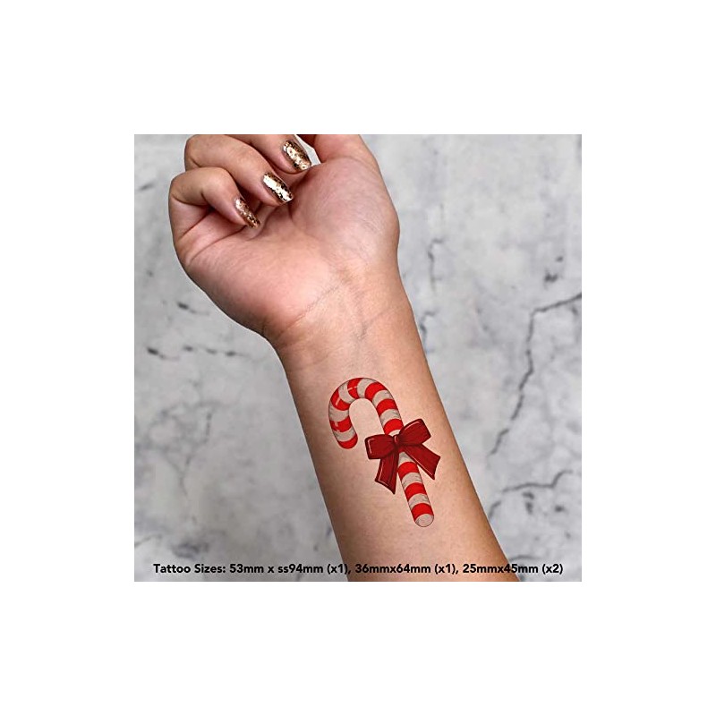 4 x 'Candy Cane With Bow' Temporary Tattoos - Water Resistant, Skin-Safe, Non-Toxic Transfers, Mixed Sizes (TO00052573)