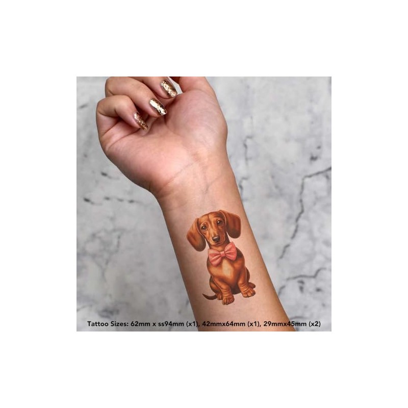 4 x 'Dachsund With Pink Bow Tie' Temporary Tattoos - Water Resistant, Skin-Safe, Non-Toxic Transfers, Mixed Sizes (TO00077436)