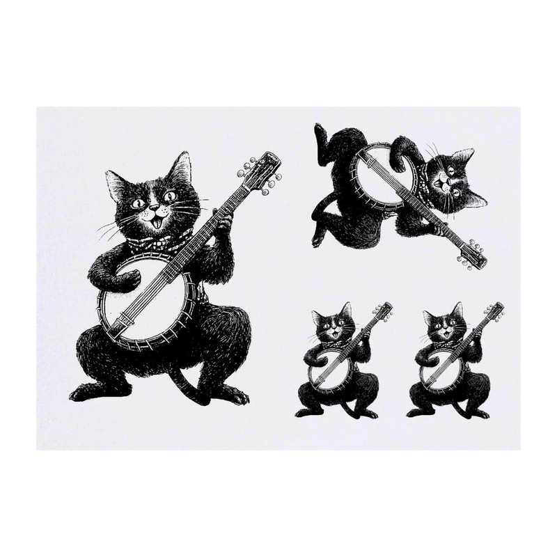 4 x 'Funny Cat Playing Banjo' Temporary Tattoos - Water Resistant, Skin-Safe, Non-Toxic Transfers, Mixed Sizes (TO00083732)