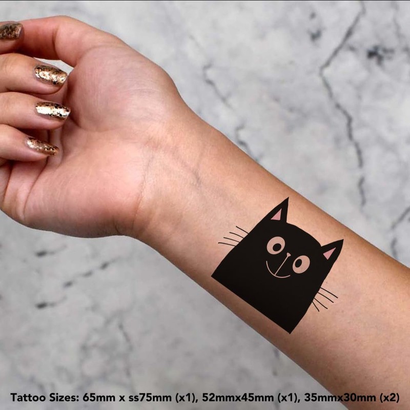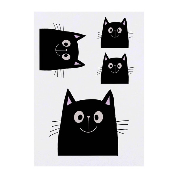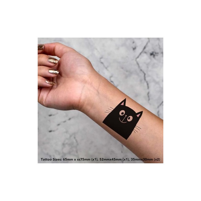 4 x 'Happy Black Cat' Temporary Tattoos - Water Resistant, Skin-Safe, Non-Toxic Transfers, Mixed Sizes (TO00076606)