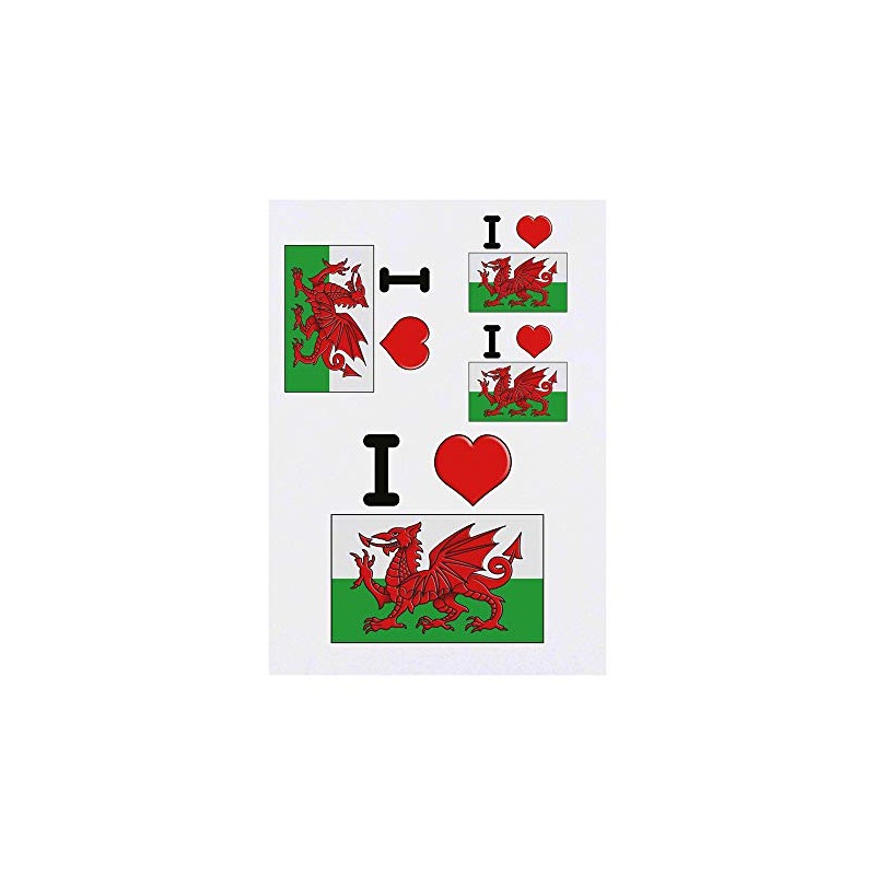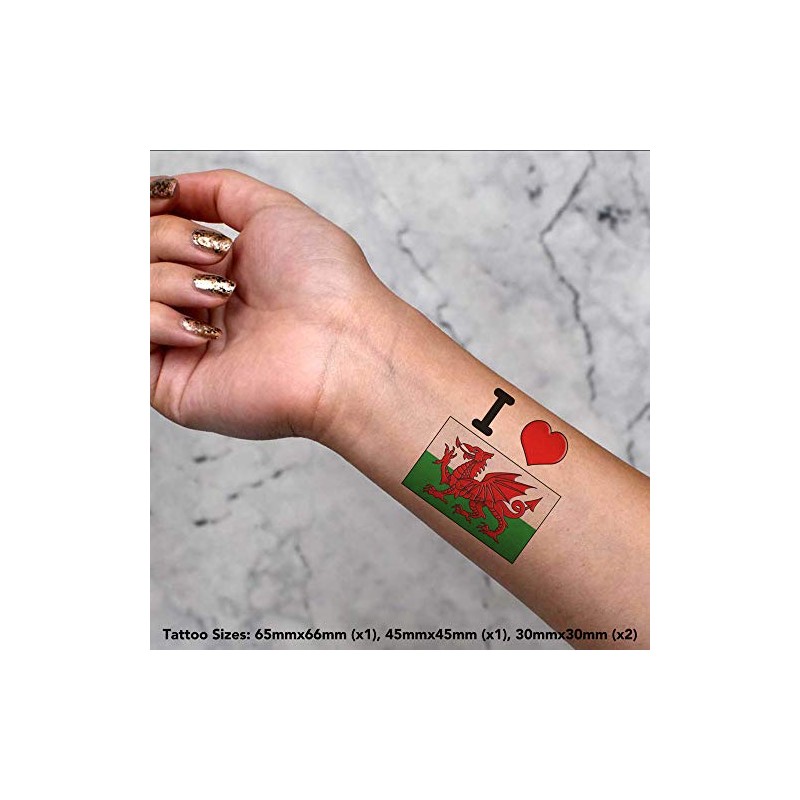 4 x 'I Love Wales' Temporary Tattoos - Water Resistant, Skin-Safe, Non-Toxic Transfers, Mixed Sizes (TO00047825)