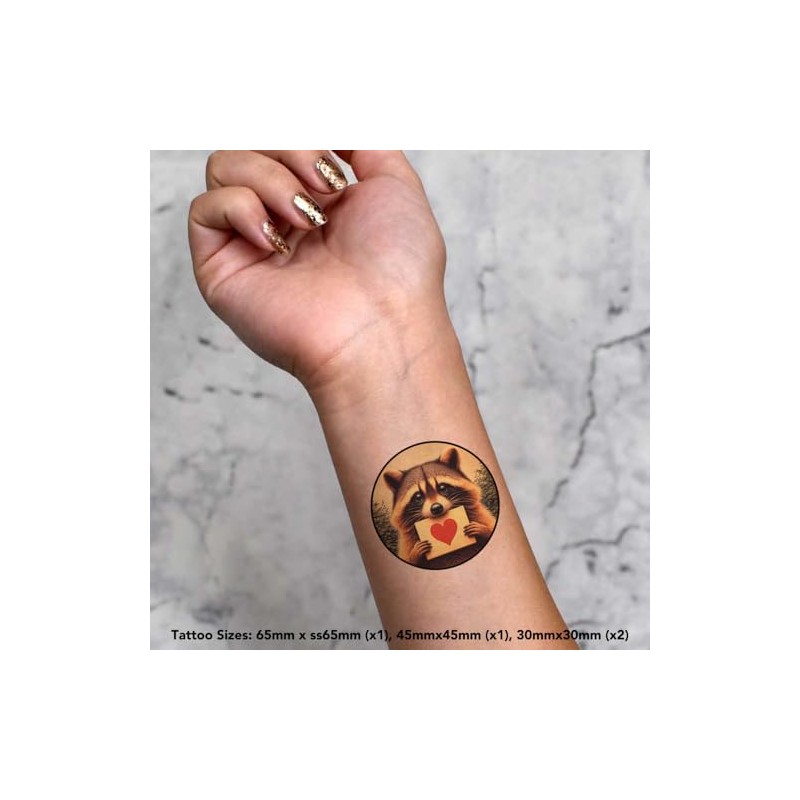 4 x 'Raccoon Love Note' Temporary Tattoos - Water Resistant, Skin-Safe, Non-Toxic Transfers, Mixed Sizes (TO00084046)