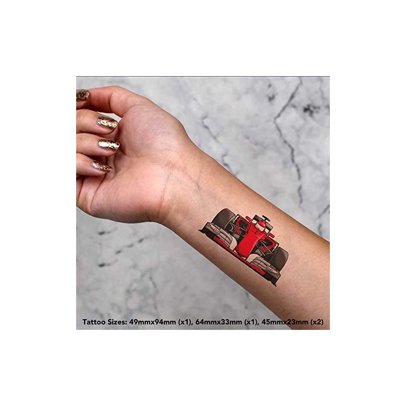 4 x 'Red Race Car' Temporary Tattoos - Water Resistant, Skin-Safe, Non-Toxic Transfers, Mixed Sizes (TO00046723)