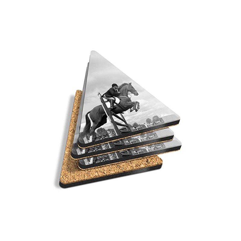 4 x Triangle Coasters - BW - Chestnut Horse Jumping Cork Backed MDF Glossy Tea Coffee Accessory #38824