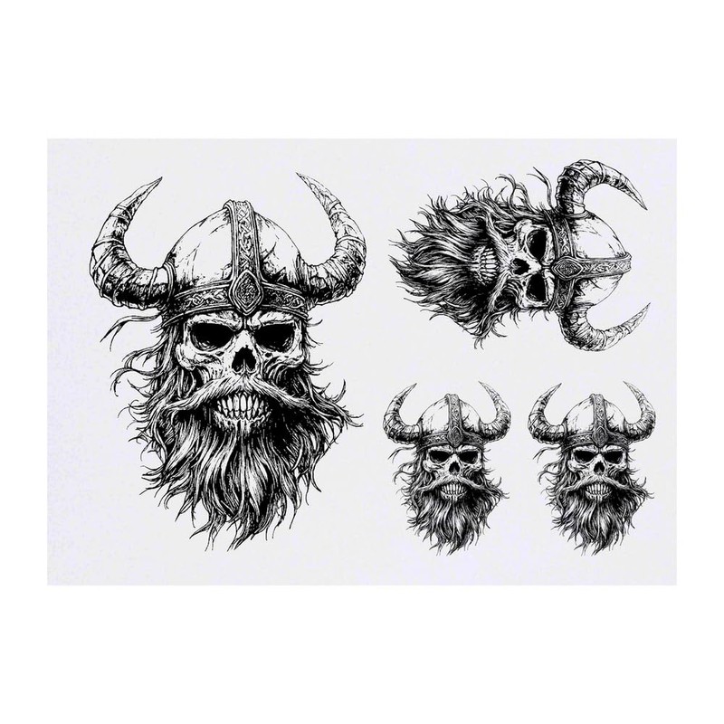 4 x 'Viking Skull' Temporary Tattoos - Water Resistant, Skin-Safe, Non-Toxic Transfers, Mixed Sizes (TO00084940)
