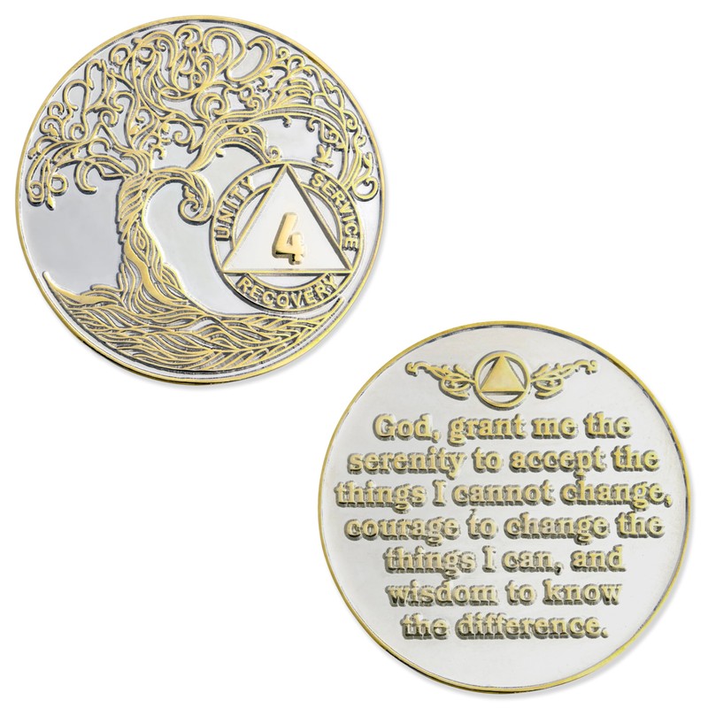 4 Year XL 40mm Nickel & Gold Plated AA Coin - Sobriety Mint Twisted Tree of Life Recovery Medallion/Chip - Silver/Gold