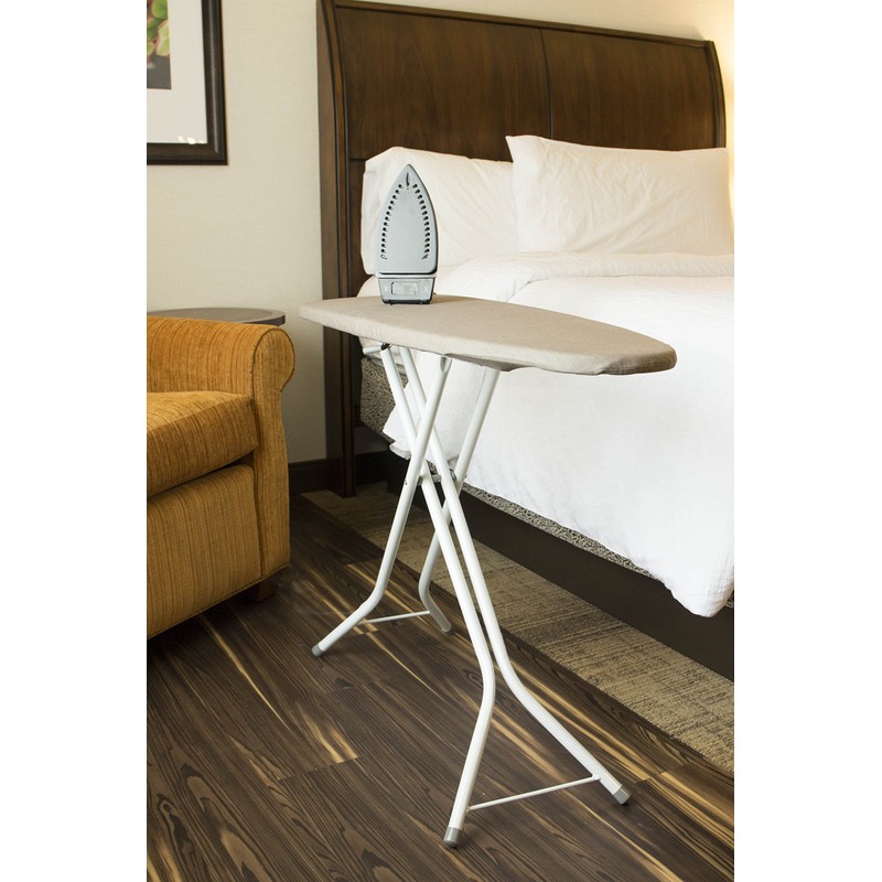 Our 40" Compact Premium Ironing Boards steel powder coated legs embody sleek sophistication. With it's khaki cover/white legs this finish suits any décor. With a 4-leg stance for maximum stability and heavy-duty no-scuff stabilizer leg end caps, this board is designed to last. Cover and pad has already been installed for you convenience. This premium ironing board has a 27"-32" inch height adjustment, 14 inches wide, and 40 inches deep.