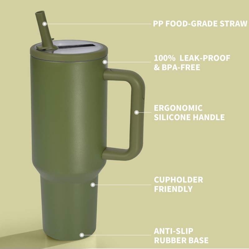 - Leakproof & Easy to Hold: Keep your drinks secure and your grip comfortable with our 40 oz stainless steel tumbler with handle and straw, featuring a leakproof twist-on flip straw lid (with silicone seal) and an ergonomic wide-grip handle designed for easy carrying