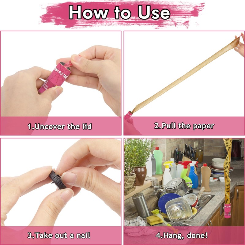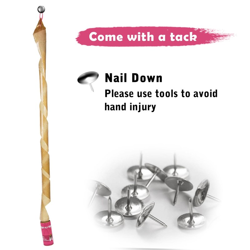 - Notice: when the weather gets hot, the gel of the fly strips melts, the red hanging string can be easily pulled off. We suggest you prepare a rope and a pair of scissors, when a small amount of sticky paper is pulled out, poke a hole in the paper with a pair of scissors and tie your rope, at last, pull the rest out cord slowly while turning tune in a counterclockwise motion. Or nail the sticky fly paper directly to the wall. It's easier to refrigerate for a while before using it!