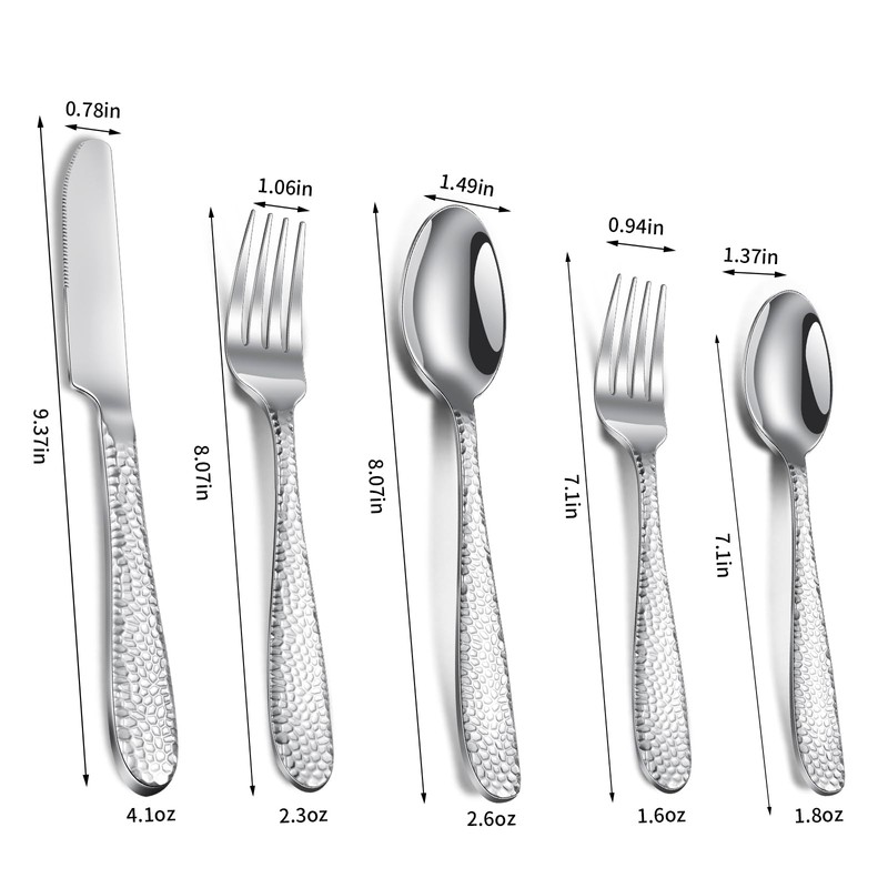 - Premium Hammered Silverware Set :This 40 Piece flatware set includes 8 dinner knives, 8 dinner forks, 8 salad forks, 8 dinner spoons and 8 teaspoons, Ideal for everyday use, home, kitchen, restaurant serving and more