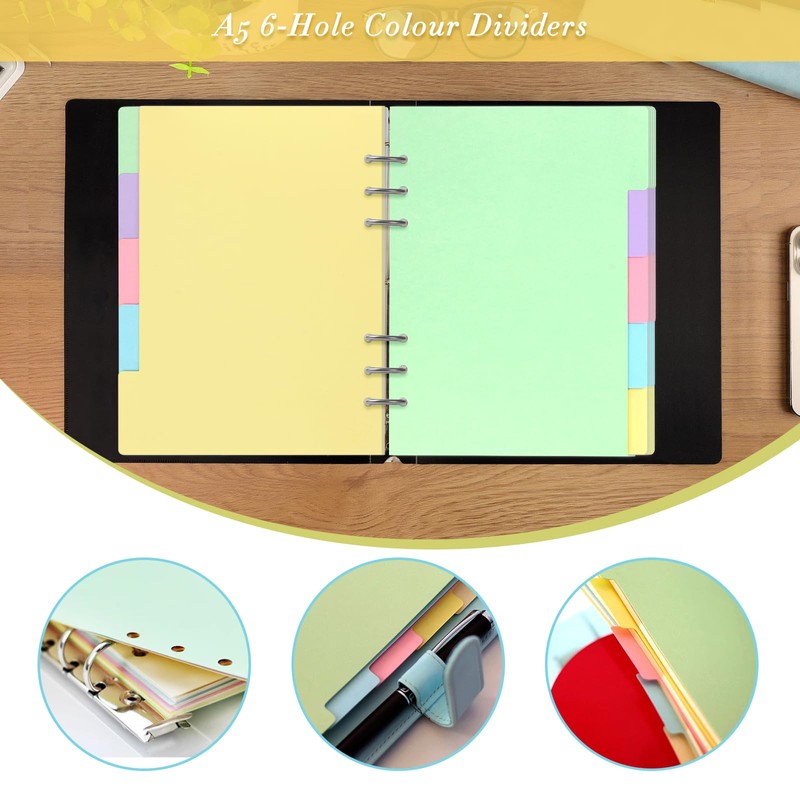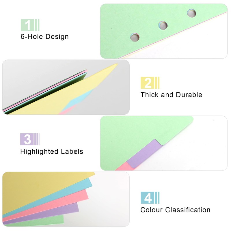 - Widely used: A5 6-hole coloured dividers are suitable for office, study and home, can be used to categorise and organise information, notes, documents, etc., help improve the use of space.