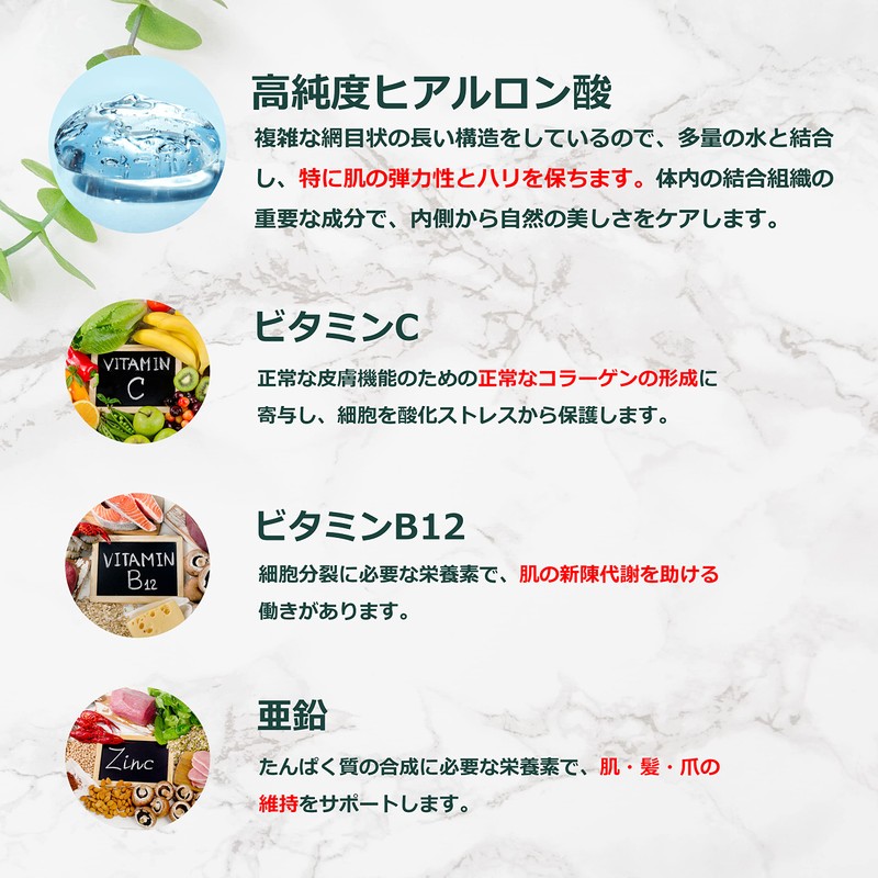 - 【1粒当たり】ヒアルロン酸 400㎎ ビタミンC 80㎎ 亜鉛 2.2mg ビタミンB12 1.2μg