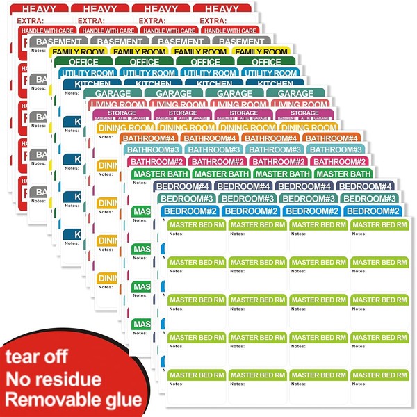 - Efficient Design: Each large sheet is identically designed, greatly enhancing usability. There's no need to carry all the labels around your home; simply make strategic use of our 400 vibrantly colored labels, arranged on 20 user-friendly sheets. Each 3-inch x 1.8-inch label showcases 20 unique designs, tailored for ten primary living spaces such as the bedroom, bathroom, dining room, storage areas, living room, garage, kitchen, utility room, office, family room, basement, and items that are fragile or overweight, ensuring every box finds its perfect place.