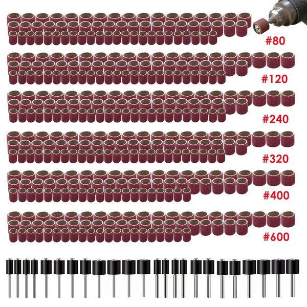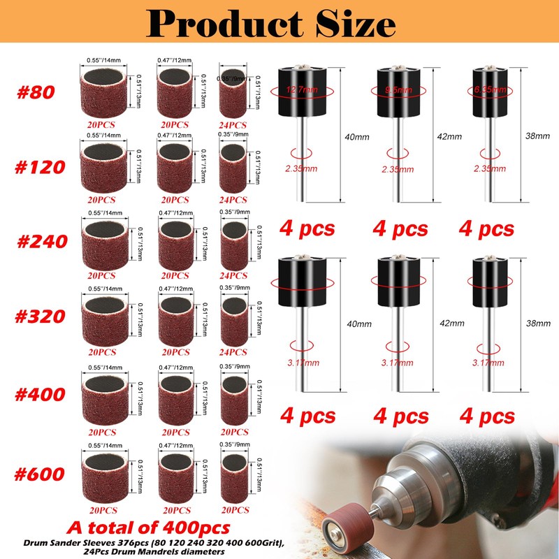 - 400pcs package include:376pcs sanding drums(80 120 240 320 400 600 Grit); 24pcs drum mandrels;The drum mandrel can be reused.There are 3 diameters in total, each with 8 diameters