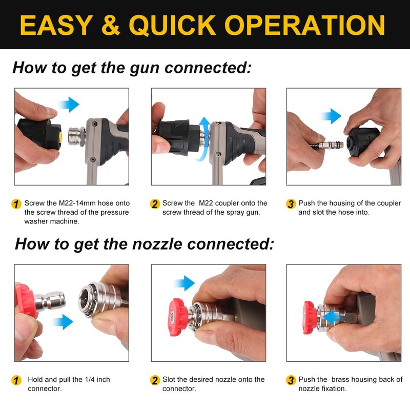 • Safe and professional: the pressure washer gun has a production lock that can prevent accidental spraying of water caused by accidental pressing. Ensure the safety of the operator and others. In addition, the cleaning gun design with a short body is easy to handle and use