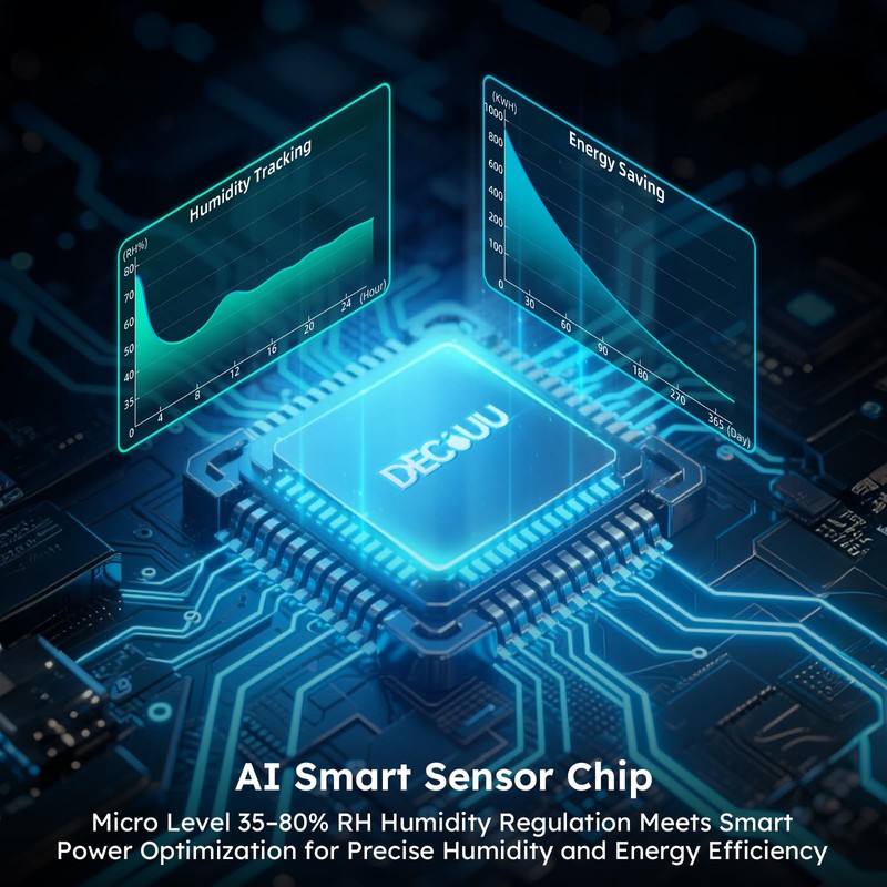 - Why is the DECIUU Dehumidifier so Outstanding? At the core of its superior performance lies our Intelligent Humidity Control System, powered by a high-precision sensor that continuously monitors ambient humidity in real time. Users can freely set their desired humidity level between 35% and 80% RH, maintaining optimal comfort and protection for your space.The built-in Smart Memory Chip restores your last settings automatically—no need to reset each time. Just power on and enjoy consistent, personalized comfort