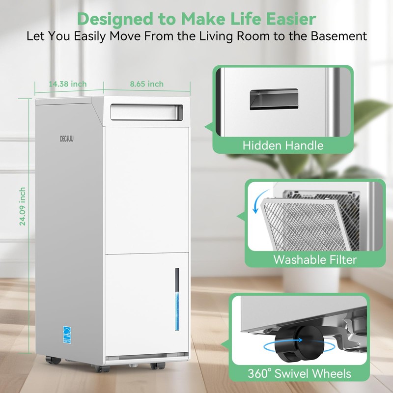 - Engineered for Easy Living: The Energy Star dehumidifier redefines efficient dehumidification.Cleverly combines a hidden handle with a 360° swivel wheel design, making it easy to move from the living room to the bathroom without any hassle. It features a removable, washable filter for convenient maintenance while continuously delivering fresh air. Despite its small size, it packs powerful performance, seamlessly combining intelligent dehumidification with easy mobility, so you won’t need to struggle with heavy lifting or frequent maintenance