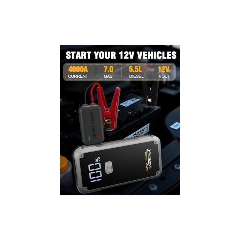 - 4000A POWERFUL JUMP STARTER - VoltSurge car jumper starter portable provides up to 4000A peak current, 2024 upgraded jump box can safely start your car (up to 7.0L Gas or 5.5.0L Diesel Engines), it is suitable for all (12 Volt) vehicle, Trucks, Motorcycles, Boats, Lawnmowers, Snowmobiles and more