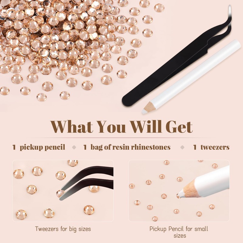 - 💎PACKAGE CONTENT -- The package contains approx. 4000 pcs of 4mm-SS16 (0.16") bling-out resin rhinestones (Champagne). The large amount will support you to fulfill a number of your wonderful DIY decoration ideas. Additionally, 1 tweezers and 1 pickup pen are included for easily picking up of glittering gems.