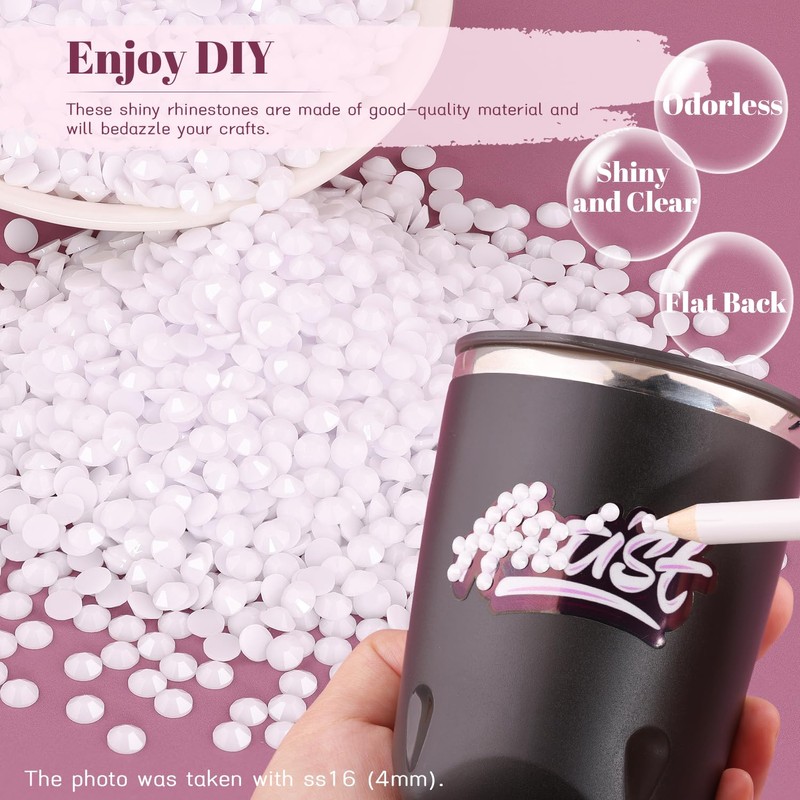 - 💎PACKAGE CONTENT -- The package contains approx. 4000 pcs of 4mm-SS16 (0.16") bling-out resin rhinestones (White). The large amount will support you to fulfill a number of your wonderful DIY decoration ideas. Additionally, 1 tweezers and 1 pickup pen are included for easily picking up of glittering gems.