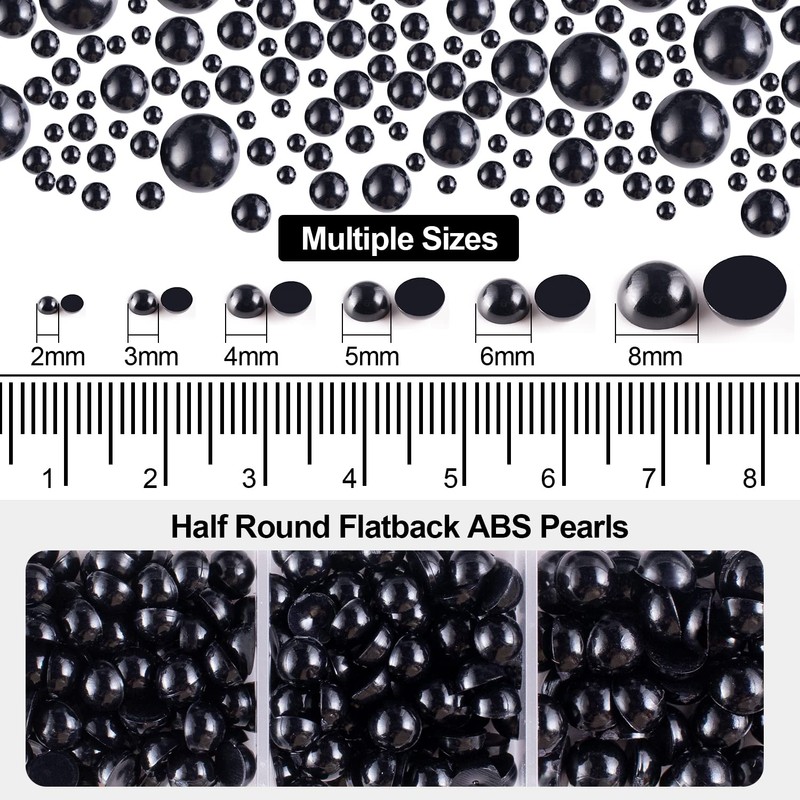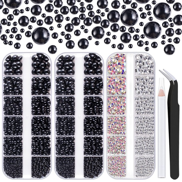 • PACKAGE CONTENT -- 2 Boxes of Black Half Round Pearls (6 sizes); 1 Box of Flat-back Round Clear & AB Rhinestones (6 sizes); 1PCS of Picker Pen and 1PCS of Tweezer.