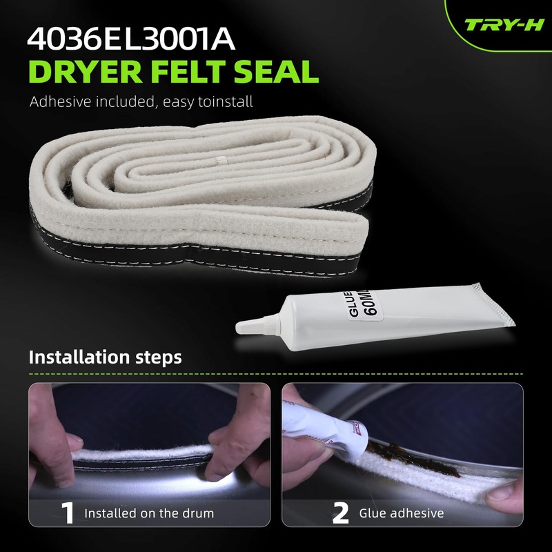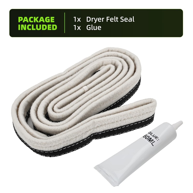 - Flexible and Durable: The dryer drum felt gasket is made of high-quality felt and fiberglass materials, which has good flexibility and is not easy to deform or damage. The matching glue is a special adhesive that can ensure that the seal is firmly bonded to the dryer surface.