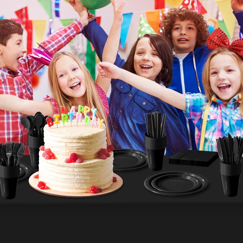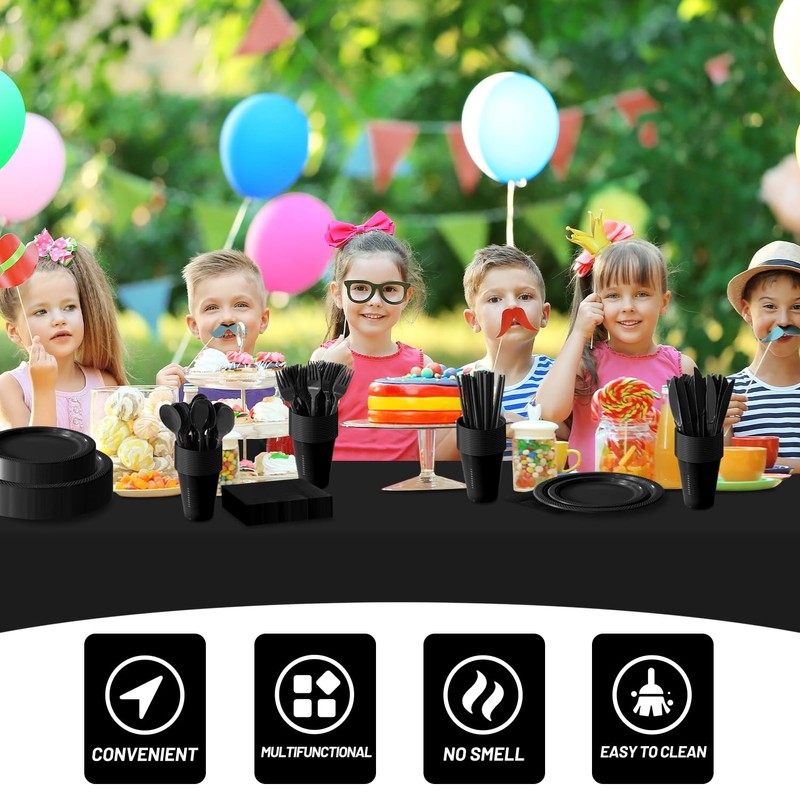 - [DISPOSABLE PLASTIC PLATES]: Our black plastic cutlery set can provide the necessary dinnerware for 50 guests. Plastic disposable plate set include 50pcs 9-inch dinner plates, 50pcs 7-inch dessert plates, 50pcs cutlery-knives, forks, spoons, 50pcs napkins, 50pcs straws, 50pcs 12oz plastic cups, and 4 pack black tablecloths. Plastic plate set have a total of 202 pieces, which are very cost-effective. It can help you complete the party setup faster and make it easier for you!