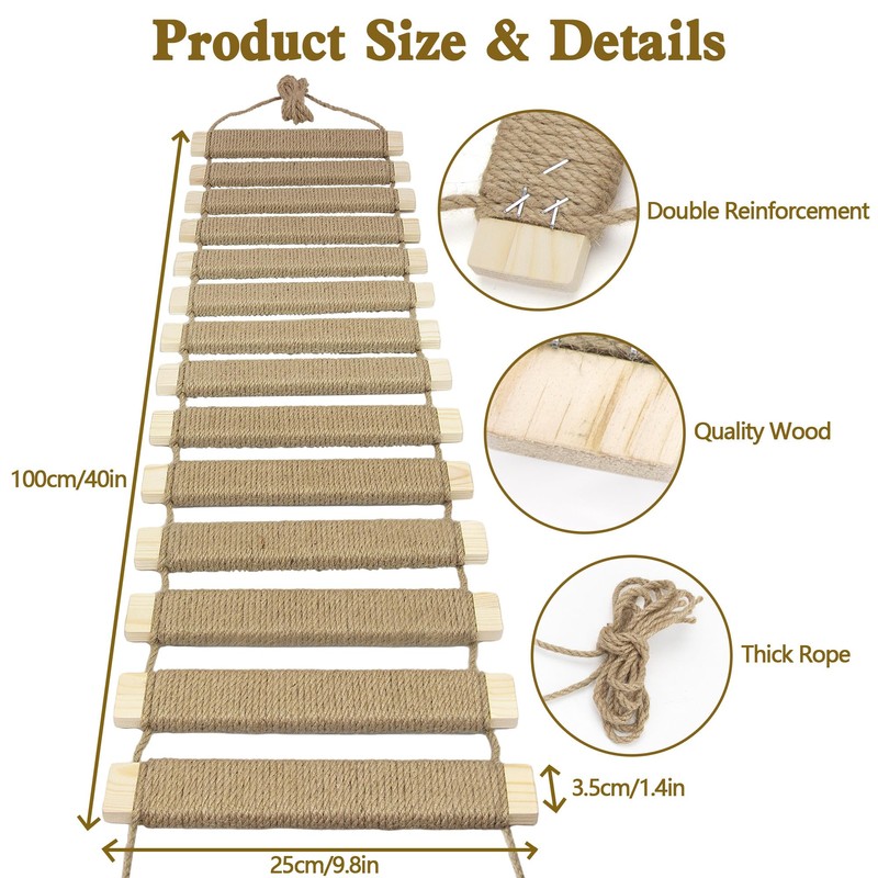 - This 40in Cat Climbing Ladder is a versatile, space-saving solution for cat owners seeking to enrich their pets’ environment. Crafted from durable wood and natural sisal rope, it doubles as a bridge, ladder, and climbing rope to satisfy cats’ instincts to climb, scratch, and explore. Its modular design allows DIY customization—attach it to cat trees, shelves, or cages to create a unique playground.