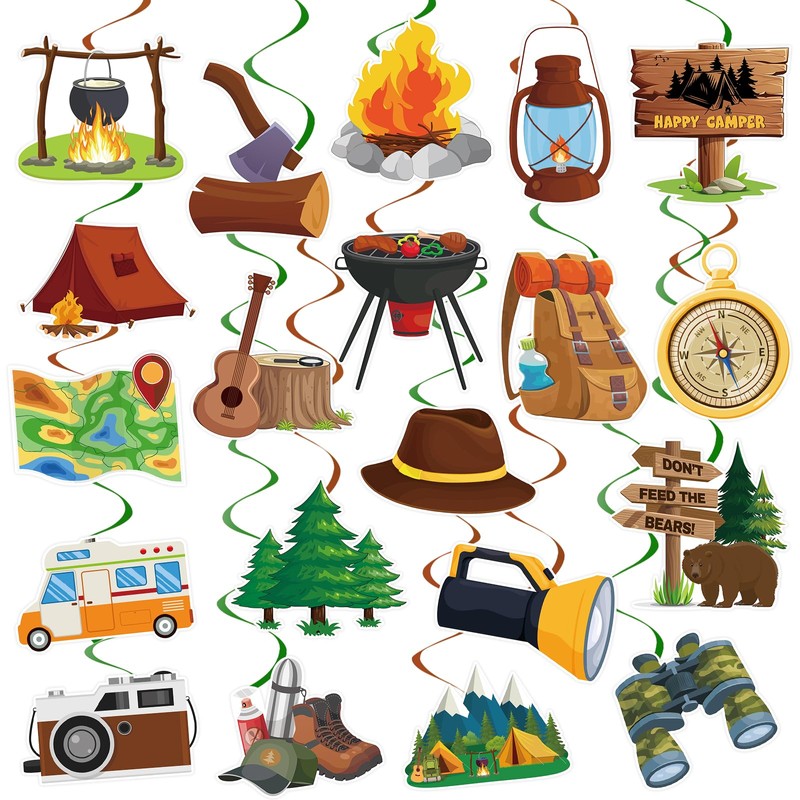 - Camping Hanging Swirl Decorations: You will get 20 pieces of happy camper party hanging swirls, there are 20 different camping styles, the patterns are rich and varied, plenty of quantity, which can easily meet your various decorating needs.
