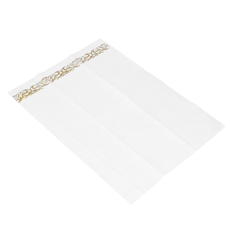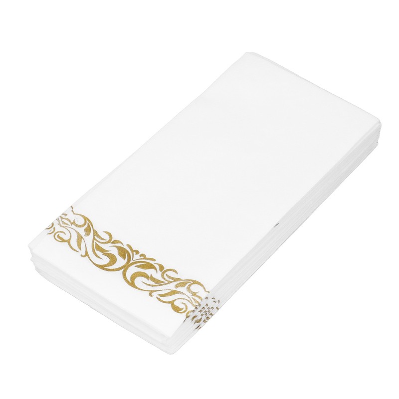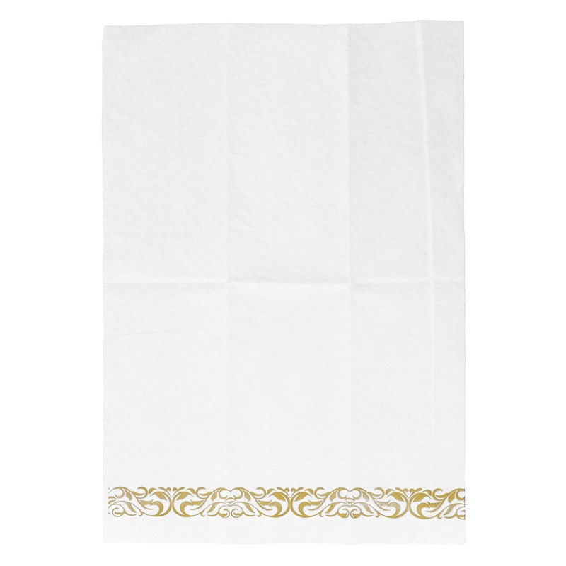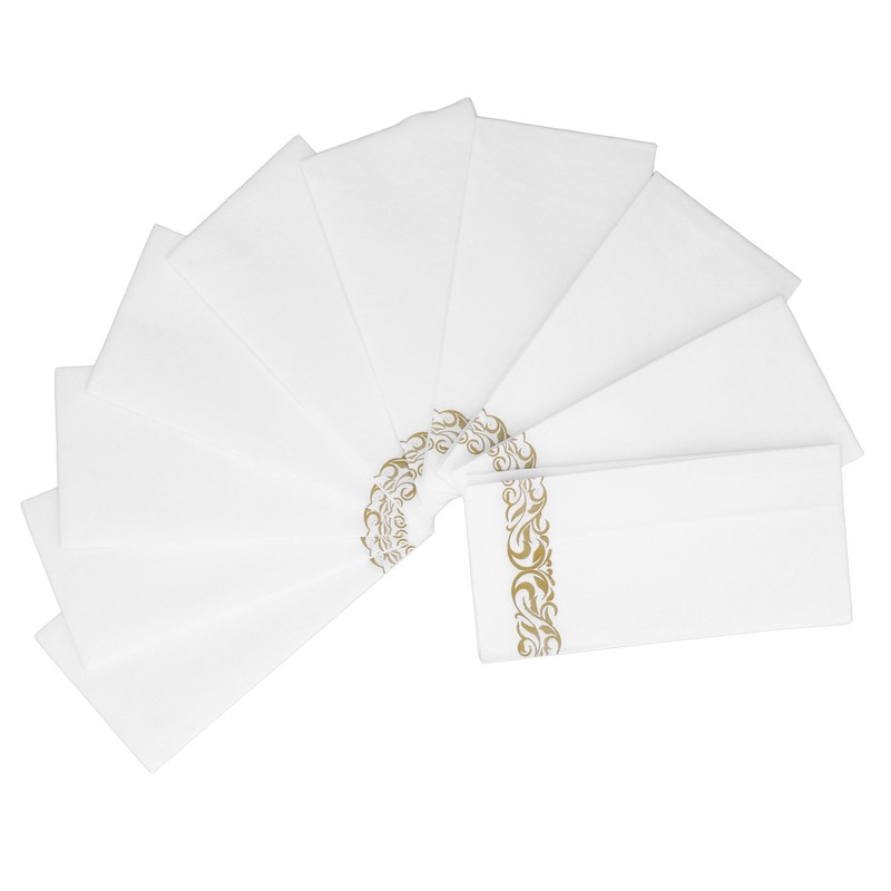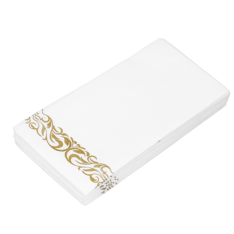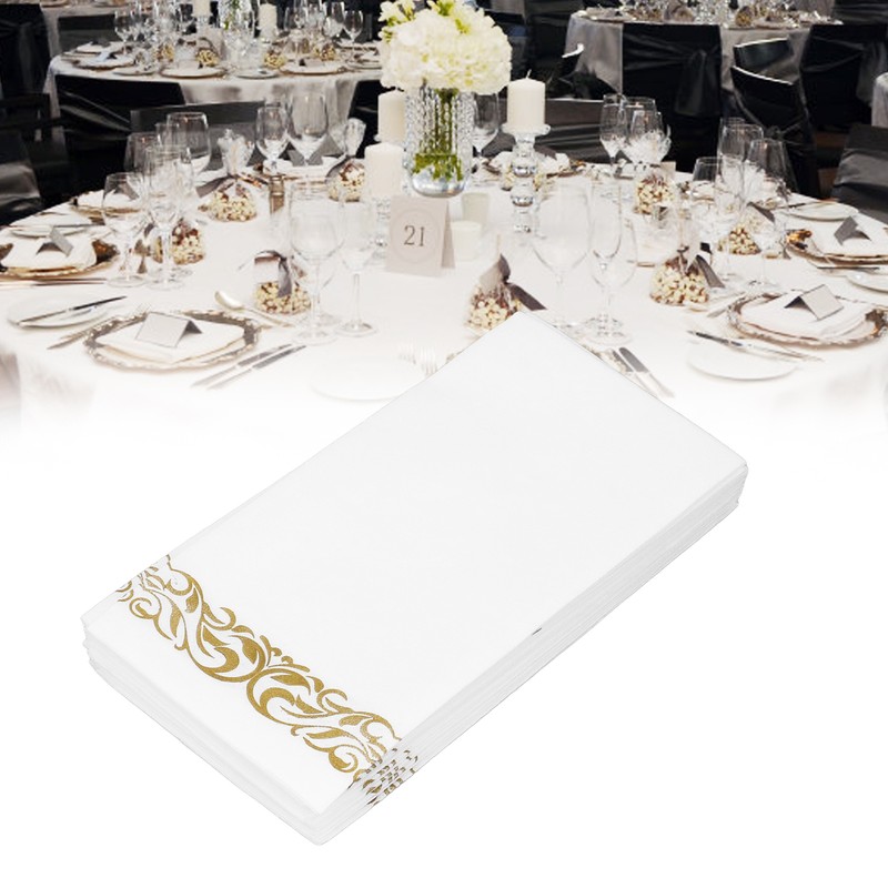 1、Gold Trim: White napkins are printed with delicate gold trim decorative designs to show your fashion sense and add glamour and elegance to your dining table, bedroom. 2、Paper Material: Dinner napkins are made of cloth like paper, which is softer and absorbent than traditional paper towels, safe and environmentally friendly. 3、Disposable Use: One time use, no cleanup required, for hand wiping, wiping down sinks and counters, appearance cleaning and other general dry use. 4、Lightweight and Portable: Paper napkins are small in size and light in weight, making it easy to carry and use, even when traveling. 5、Applicable Scenarios: Wedding napkins are perfect for wedding receptions, cocktail parties, dinner parties, anniversaries, family events, friendship parties or any event you want.