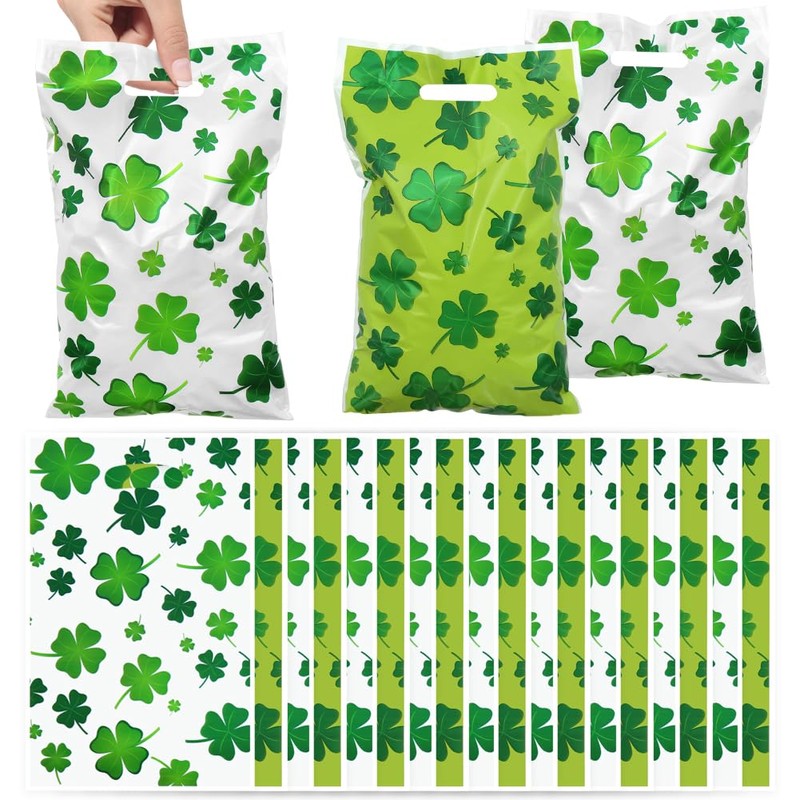 40pcs St. Patrick's Day Four-leaf Clover Gift Bags with Die Cut Handle, Green and White Double-side Color Print Lucky Cellophane Plastic Candy Cookie Treat Goodies Bag Saint Patricks Day Party Favor