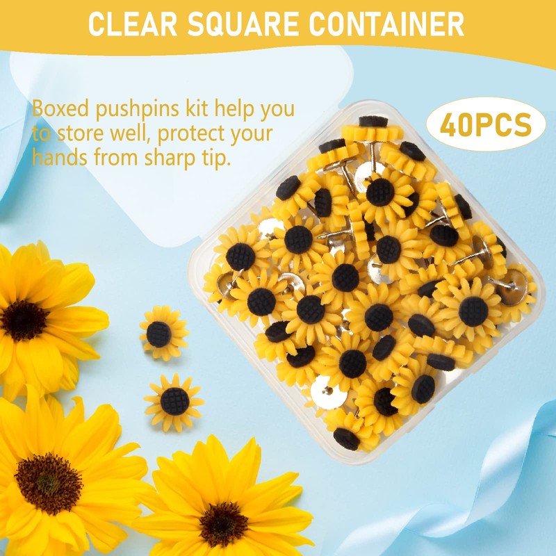 40Pcs Sunflower Push Pins, Winspeed Cute Decorative Sunflowers Push Pins for Cork/ Bulletin Board with Square Box, Sturdy Sunflower Thumbtacks for Holding Photos Files (16x16mm)
