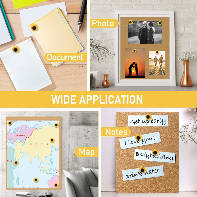 Beautiful sunflower thumbtack is cute and exquisite, bright in color, a practical decorative tool for many crafts and other items. Suitable for bulletin boards, cork boards, photo walls, photos, documents, papers, maps, notes, crafts, ticket stub and more.