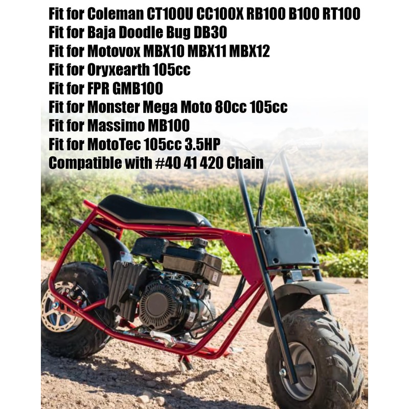 - Widely Adaptable: Mini bike sprocket fit for Coleman CT100U CC100X RB100 B100 RT100, fit for Baja Doodle Bug DB30, fit for Motovox MBX10 MBX11 MBX12, fit for Oryxearth 105cc, fit for FPR GMB100, fit for Monster Mega Moto 80cc 105cc, fit for Massimo MB100, fit for MotoTec 105cc 3.5HP, compatible with #40 41 420 Chain