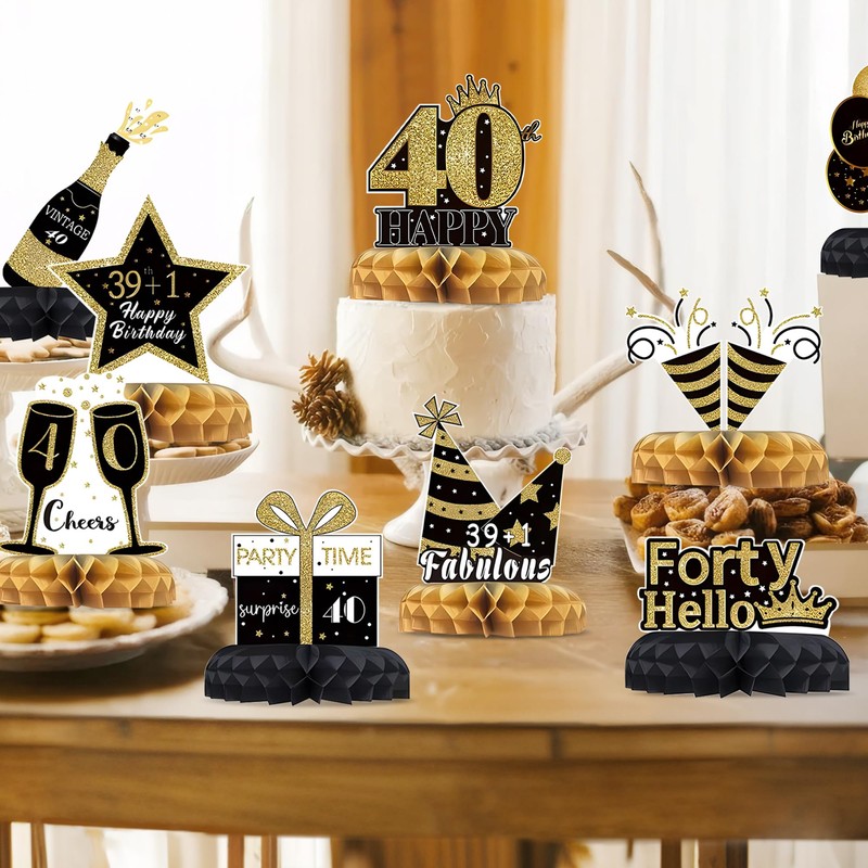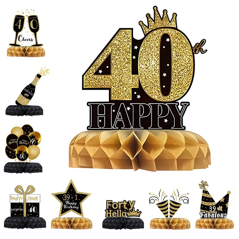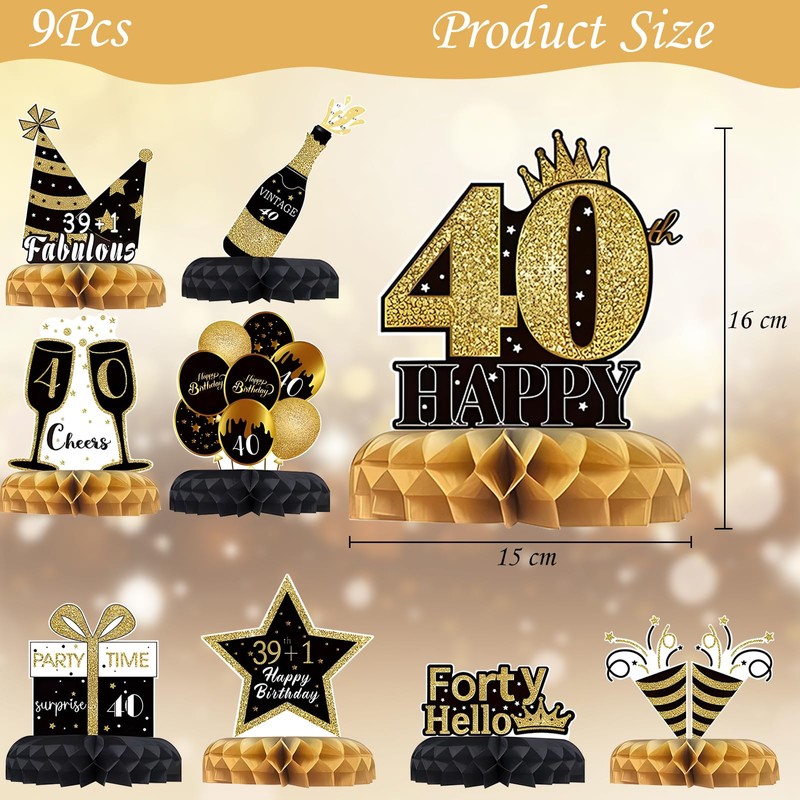 - 40th Birthday Decorations Includes: This 40th birthday table decorations includes 9pcs 40th birthday honeycomb table decorations: happiness, cheers, champagne, balloons, gifts, stars, hello, birthday hat, horn