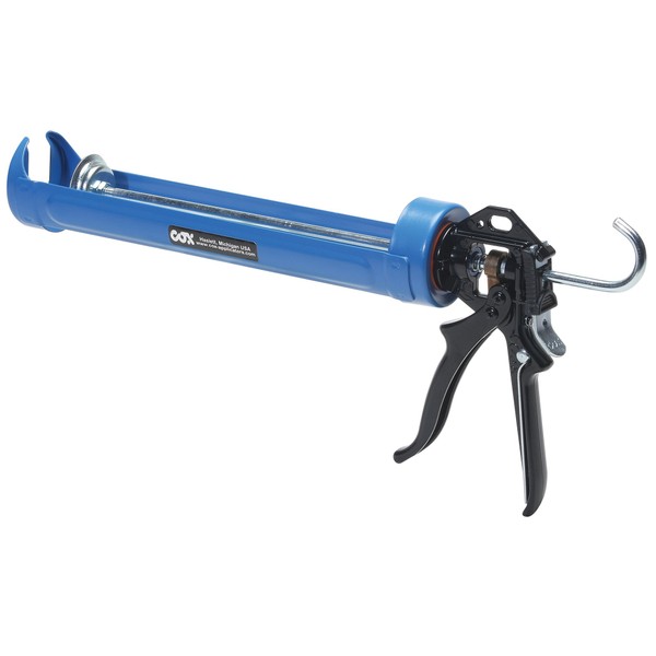 The Cox North American jumbo quart mechanical caulk gun provides approximately double the life of other caulk guns. Made with a die-cast zinc alloy body, it features a mechanical advantage of 12:1, a wear compensating device, a built-in ladder hook, a sintered steel catch plate, and a thumb-activated instant pressure release. All the components are replaceable for easy repair. The caulk gun uses a standard 29-ounce cartridge and comes with a 1-year limited warranty.
