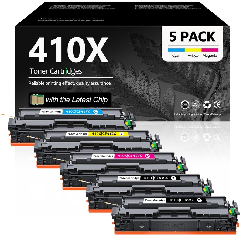 • Package Includes: 2 pack 410X black toner, 1 pack 410X cyan toner, 1 pack 410X magenta toner, 1 pack 410X yellow toner (5-Pack High Yield 410X Toner Cartridges)