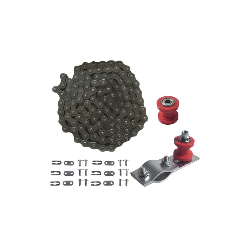 - Package include:1*Red Chain tensioner Adjuster W/Guide wheel ,1*Red 8mm chain tensioner Guide wheel,1*415H Chain 110L Link,6*415H Chain Connector Link