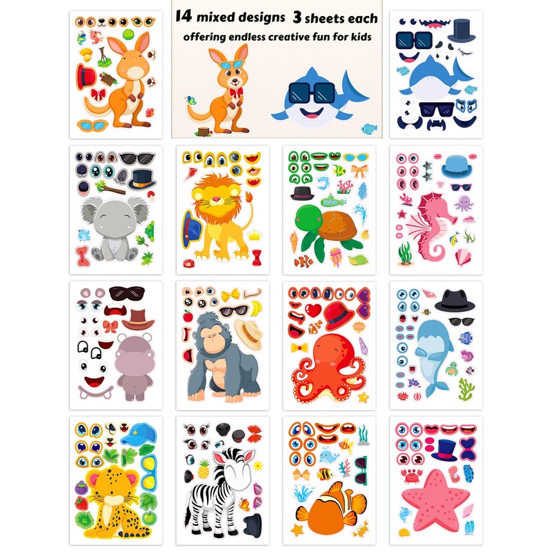 - Mix and Match Your Own Stickers: Each sheet has different eyes, mouths, and accessories; kids can create silly or cute faces they love; offering endless creative fun for kids to make their own cartoon animal faces