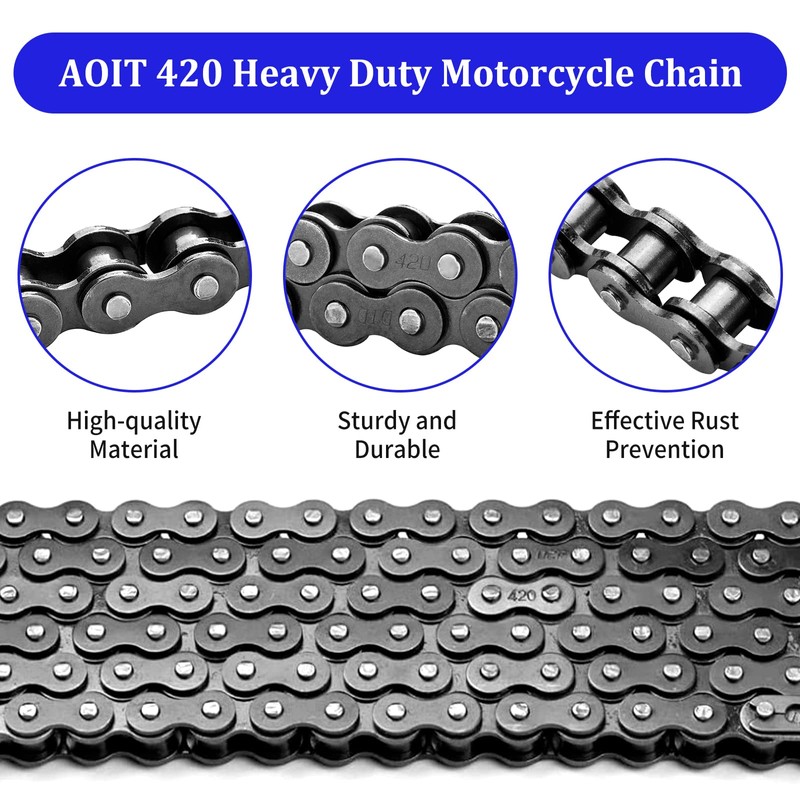 - POWERFUL: AOIT 420 Motorcycle Chain is super economical roller chain. Standard chains have two-point pin riveting. Heavy-duty SR chains come with four-point riveting and solid bushings for longer wear. Special steel alloy, solid roller and pre-stretched, shot-peened parts. Tensile Strength 4,300lbs.